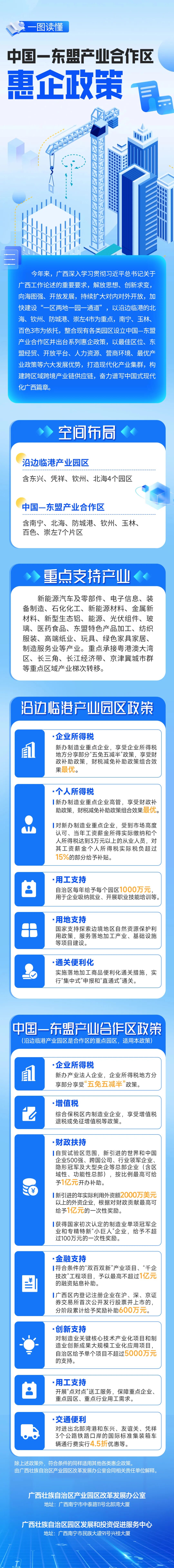 广西是我国面向东盟开放合作的前沿和窗口,目前正加快推进“一区两地一园一通道”建设,以沿边临港的北海、钦州、防城港、崇左4市为重点,南宁、玉林、百色3市为依托,整合现有各类园区设立中国—东盟产业合作区并出台系列惠企政策。