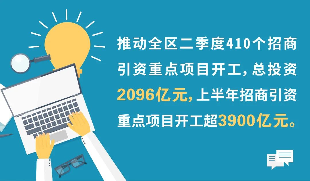 截至6月底,推动全区二季度410个招商引资重点项目开工,总投资2096亿元,上半年招商引资重点项目开工超3900亿元,以项目开工见效稳住支撑全区经济增长的基本盘。