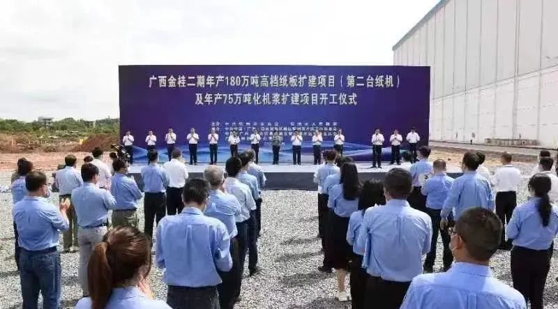 5月30日,广西金桂浆纸业有限公司二期工程年产180万吨高档纸板扩建项目(第二台纸机)和年产75万吨化机浆扩建项目举行开工仪式