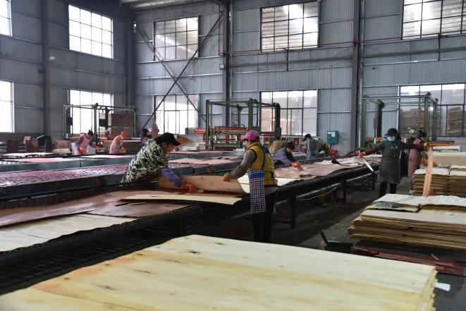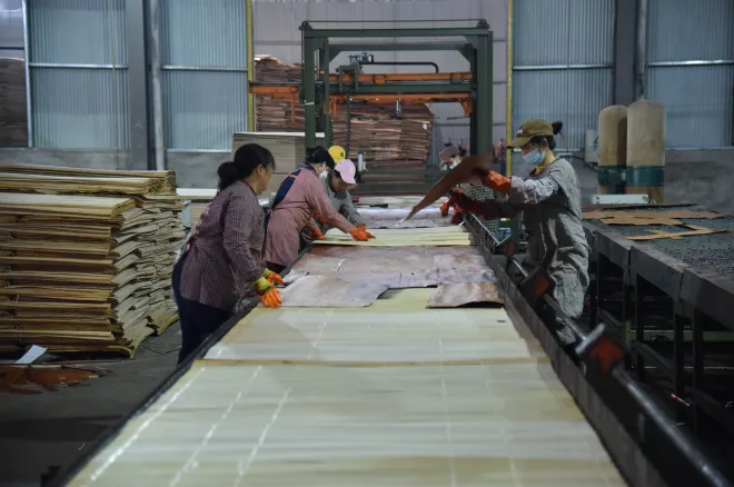 近日,在广西桂中(鹿寨)现代林业科技产业园中的广西柳州古宏木业有限公司的车间内,工人正忙着挑选板材,进行板材布胶与排板。
