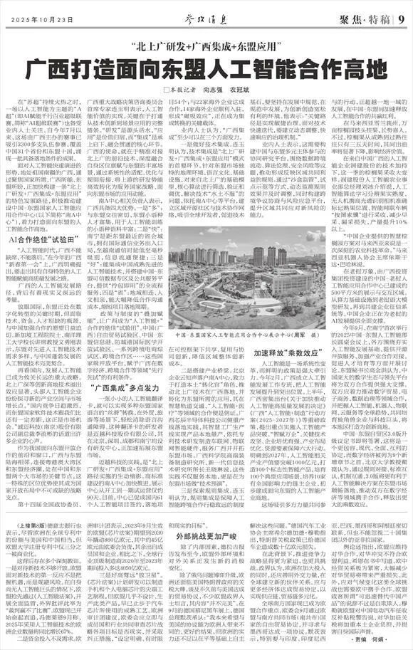 10月23日,《参考消息》第9版刊发文章《广西打造面向东盟人工智能合作高地》,全文如下: