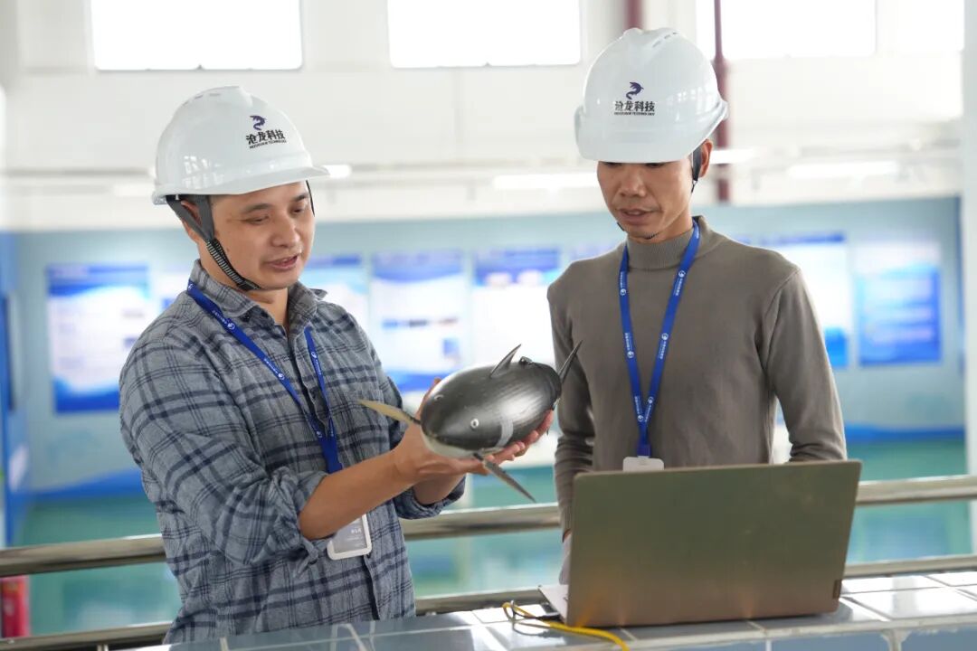 技术人员展示仿生鱼水下机器人产品。融媒体记者 黄浦 摄