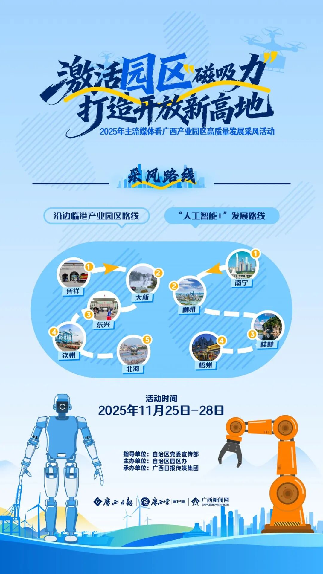 激活园区“磁吸力”,打造开放新高地。在自治区党委宣传部指导下,由自治区产业园区改革发展办公室、广西日报传媒集团联合举办的2025年主流媒体看广西产业园区高质量发展采风活动于11月25日启动。