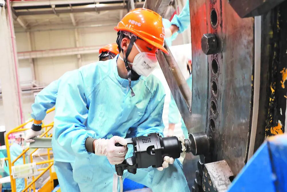 在中车百色新能源装备产业基地,工人在打预制叶根螺栓套。