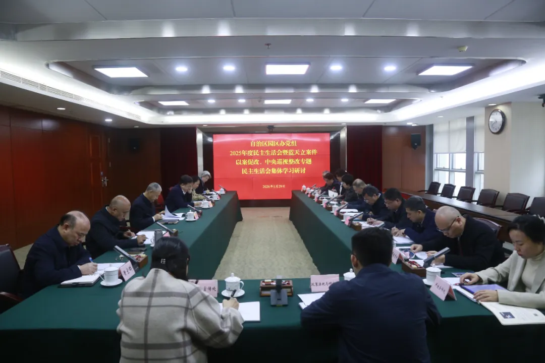 1月29日,自治区园区办党组开展2025年度民主生活会暨蓝天立案件以案促改、中央巡视整改专题民主生活会集体学习研讨,深入学习领会习近平新时代中国特色社会主义思想、习近平总书记关于党的自我革命的重要思想和关于加强党的作风建设的重要论述,聚焦2025年度民主生活会主题和要求检查剖析的七个方面重点问题,深化思想认识,找准思想根源,为高质量开好民主生活会筑牢思想根基、凝聚行动共识。自治区园区办党组书记、主任邹展业主持会议并讲话。