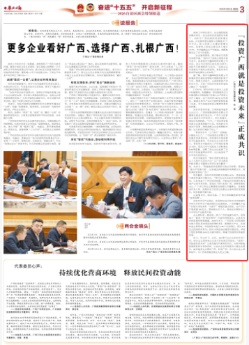 报告提到,2025年实有经营主体增长4.2%,更是得益于营商环境的不断优化。“我们企业在2025年有新项目落地,正是受益于广西的扶持政策,平陆运河的发展机遇与AI产业的布局优势,更坚定了我们扎根广西、深耕发展的决心。”广西三环企业集团股份有限公司董事长、总裁陈诚代表介绍,政策的有力支持让民营企业迎来更好发展契机,投资热潮不断升温。