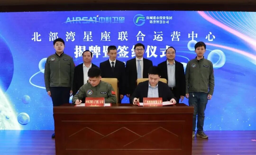 2月5日,“北部湾星座联合运营中心”揭牌暨签约仪式在防城港市民中心成功举行。防城港市委常委、副市长陈光炯,市投资集团党委书记、董事长张帆,中科卫星集团副总裁、广西公司总经理张生青,共同为“北部湾星座联合运营中心”揭牌,与会领导一同见证市投资集团下属广西铭誉智慧服务有限公司与中科卫星(广西)科技有限公司正式签署合作协议。