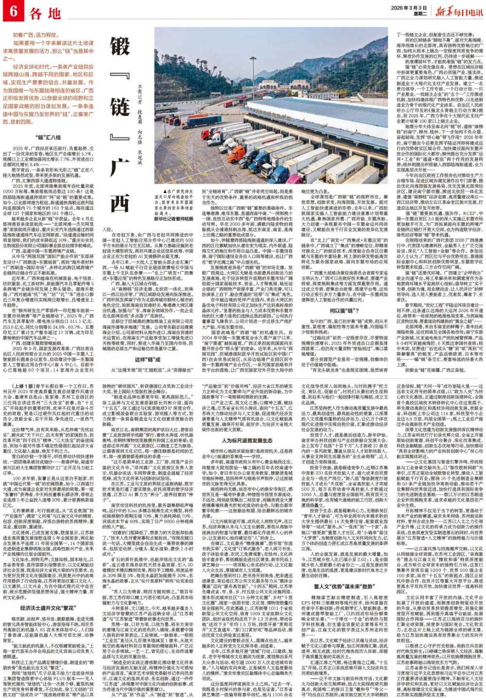 北部湾港,来自东南亚的鲜椰子、香米经此海陆衔接,运往西南及全国各地市场;南宁东部产业新城,比亚迪电池生产线机械臂挥舞,产品8小时可到越南海防、6天抵达泰国林查班;桂中来宾,甘蔗进厂后完成从“糖”到“纸”再到“可降解餐具”的蜕变,产品远销欧美、日本等市场……一幅“链”条交汇、要素畅流的场景火热上演。