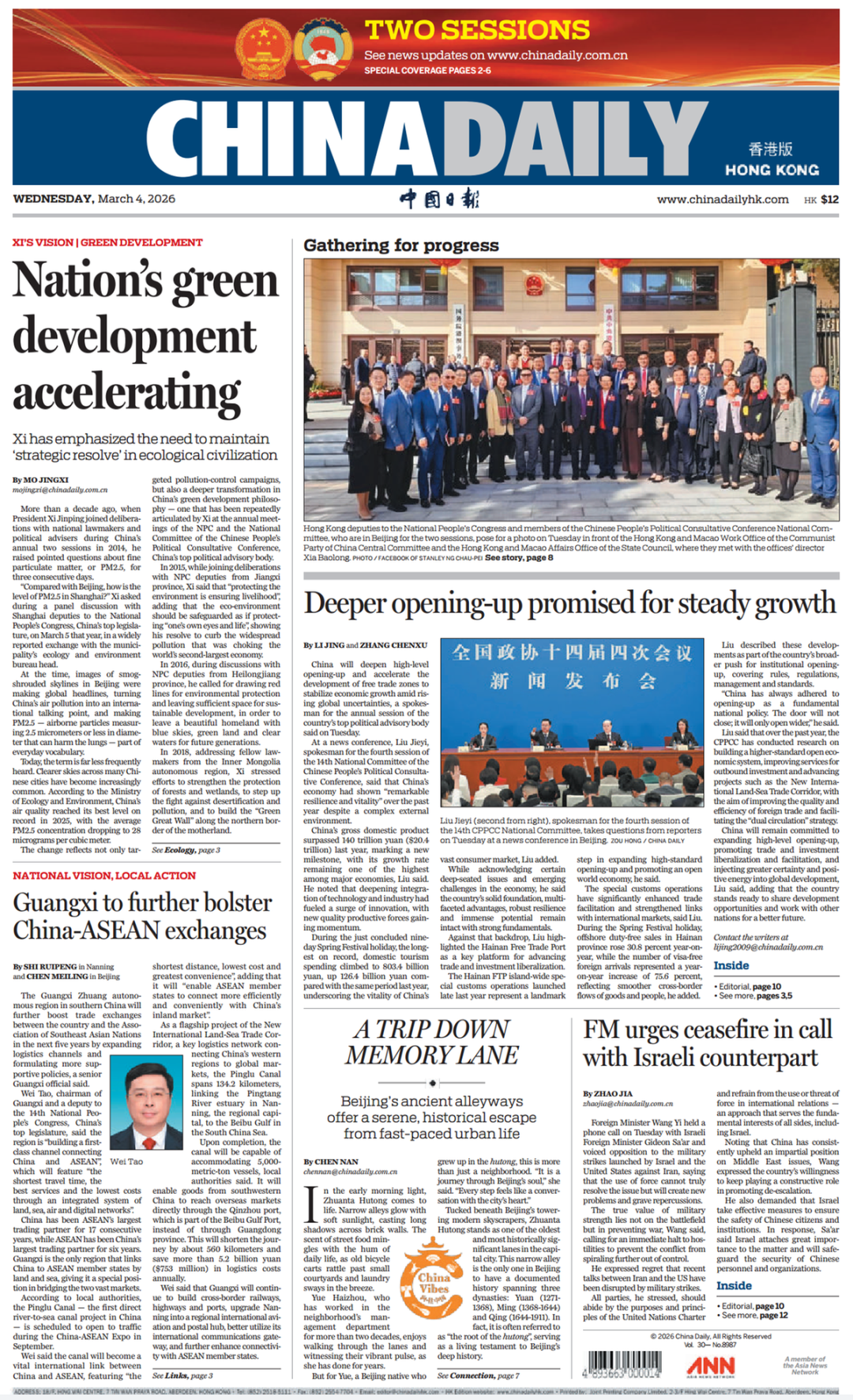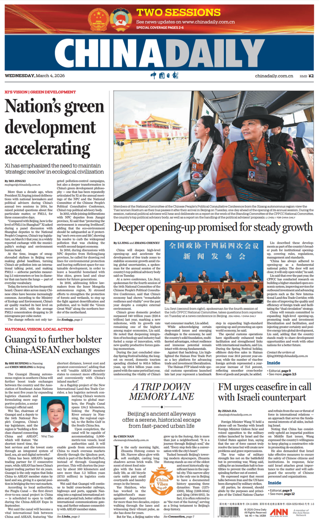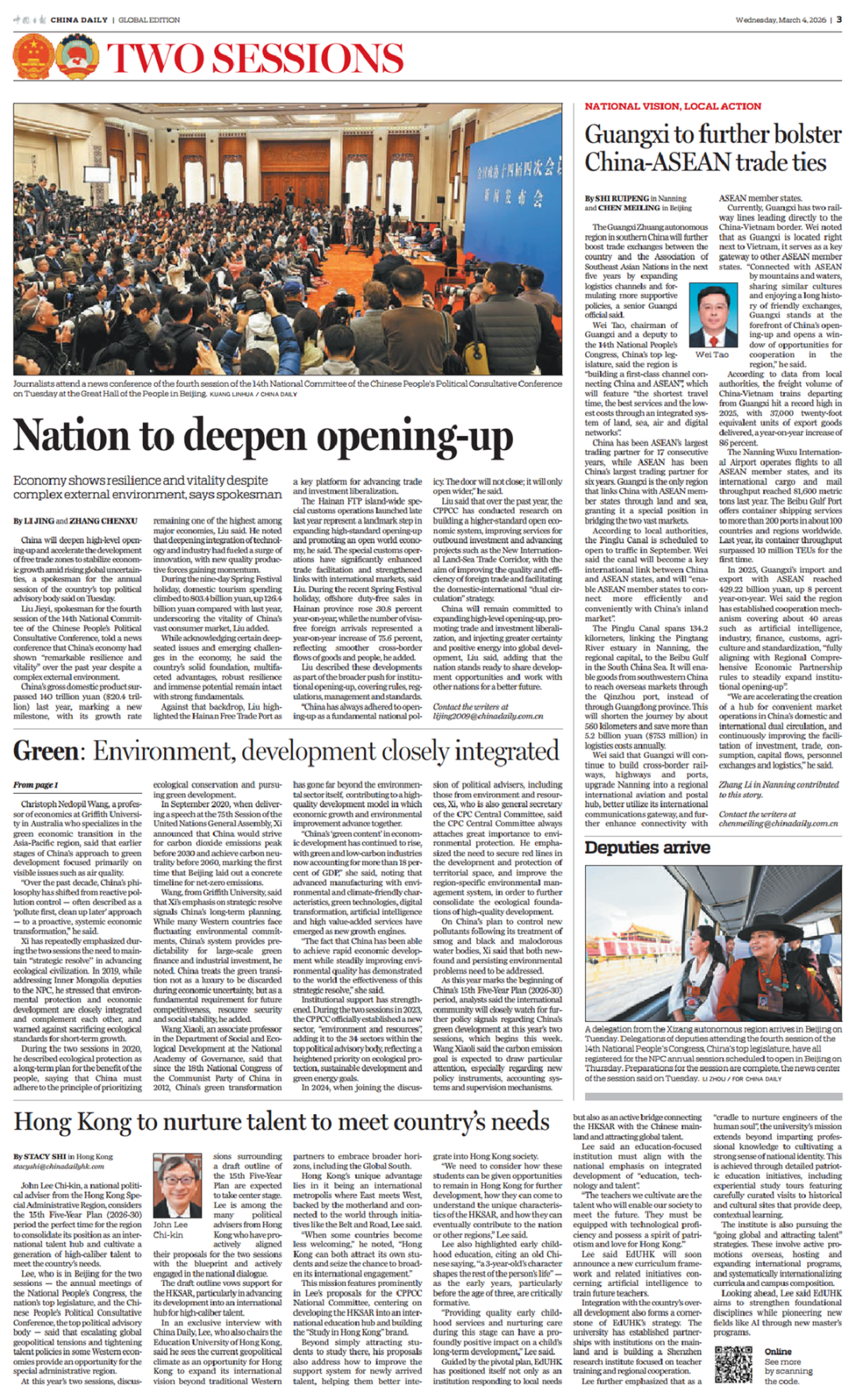 2026年全国两会期间,《中国日报》推出“中国式现代化的地方实践” (National Vision, Local Action)高端访谈栏目,讲述中国式现代化建设道路上的地方特色实践。广西沿海、沿边、沿江,是我国唯一与东盟陆海相连的省区,连接着中国与东盟两个广阔市场。随着我国构建新发展格局深入推进、中国—东盟自贸区3.0版加快建设,广西独特区位优势将更加凸显。“十五五”时期,广西将如何依托自身优势抢抓机遇、努力在深化中国—东盟各领域合作全面发展中发挥更大作用?中国日报社记者就此专访了全国人大代表、广西壮族自治区主席韦韬。今日,《中国日报》头版刊发专访文章《充分发挥面向东盟开放合作的前沿和窗口作用 更好服从服务于构建中国—东盟命运共同体》(Guangxi to further bolster China-ASEAN exchanges)。