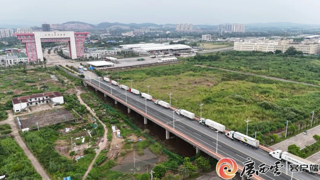 东兴口岸北仑河二桥上车流如织,一辆辆满载货物的货车有序排队,等待通关。记者 苑长军 摄