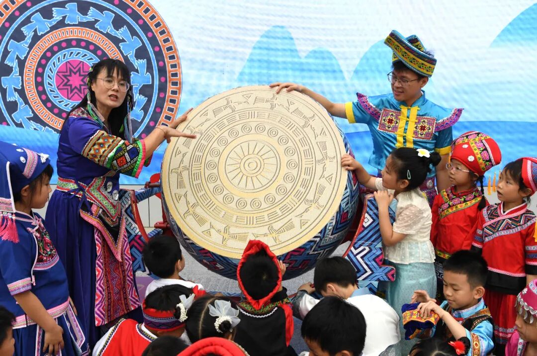 一名老师在广西南宁市滨湖路小学为孩子们讲解铜鼓图案 新华社记者 周华 摄
