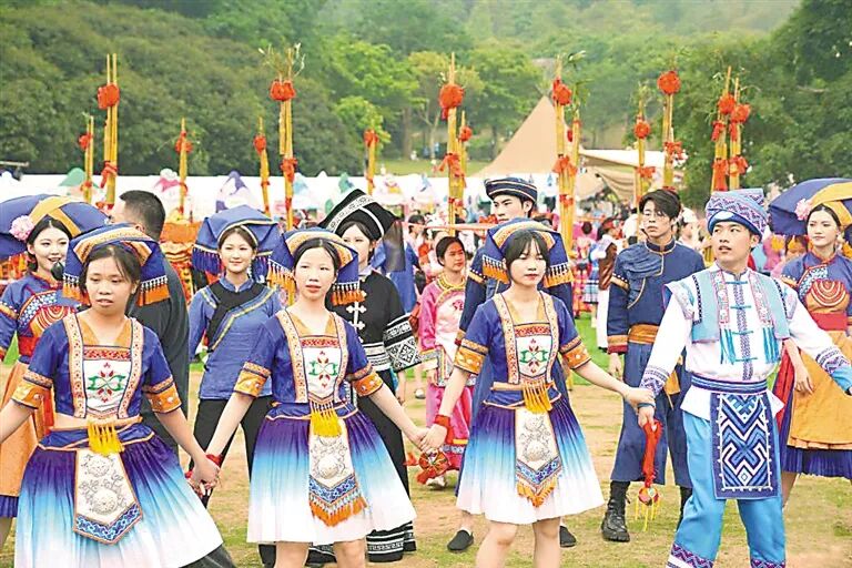 2023年广西“壮族三月三·八桂嘉年华”开幕式现场的齐跳“同心舞”活动。新华社发